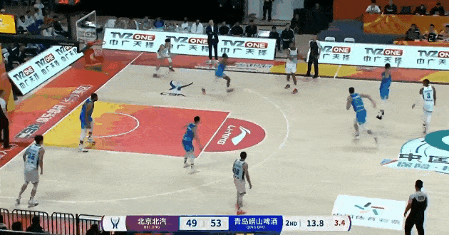 赵嘉义底角三分再中半场三分3中3,青岛半场56-49领先北京