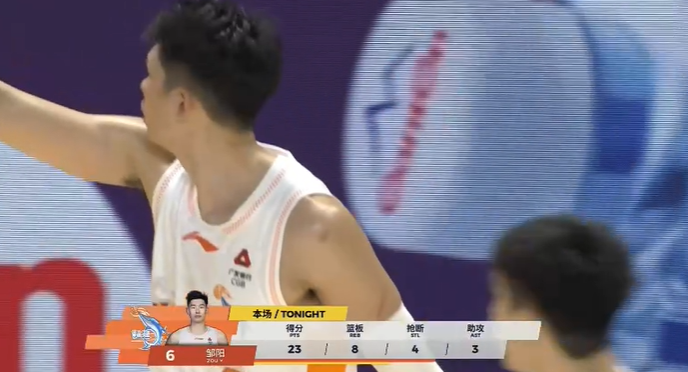 虎扑邹阳全场13投9中,三分5中3得到23分8篮板3助攻4抢断