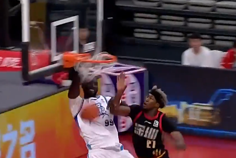 虎扑崔永熙沿底线突破欲起飞隔扣,但被福建外援马昆杜摁帽