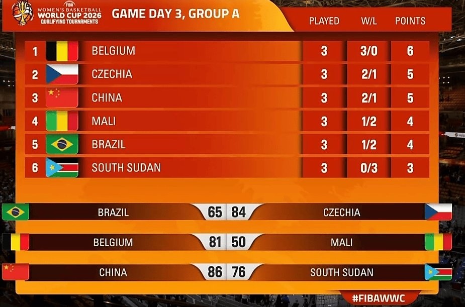 女篮世预赛积分榜:比利时第一,中国女篮位列第三