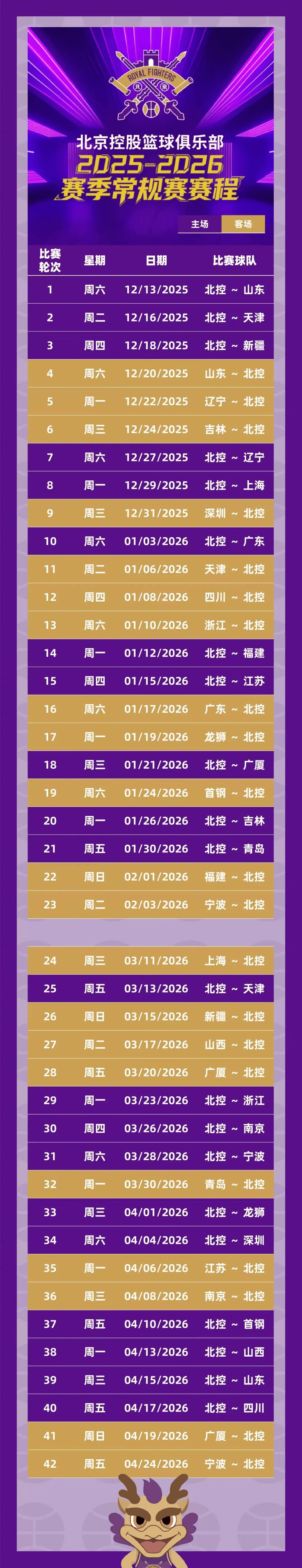 北控男篮社媒分享常规赛赛程:揭幕战将对战山东男篮