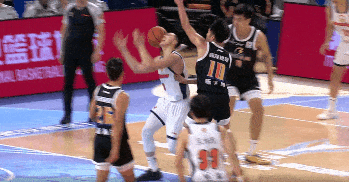 胡明轩突破飞身上篮落地受伤,随后缓缓起身继续比赛