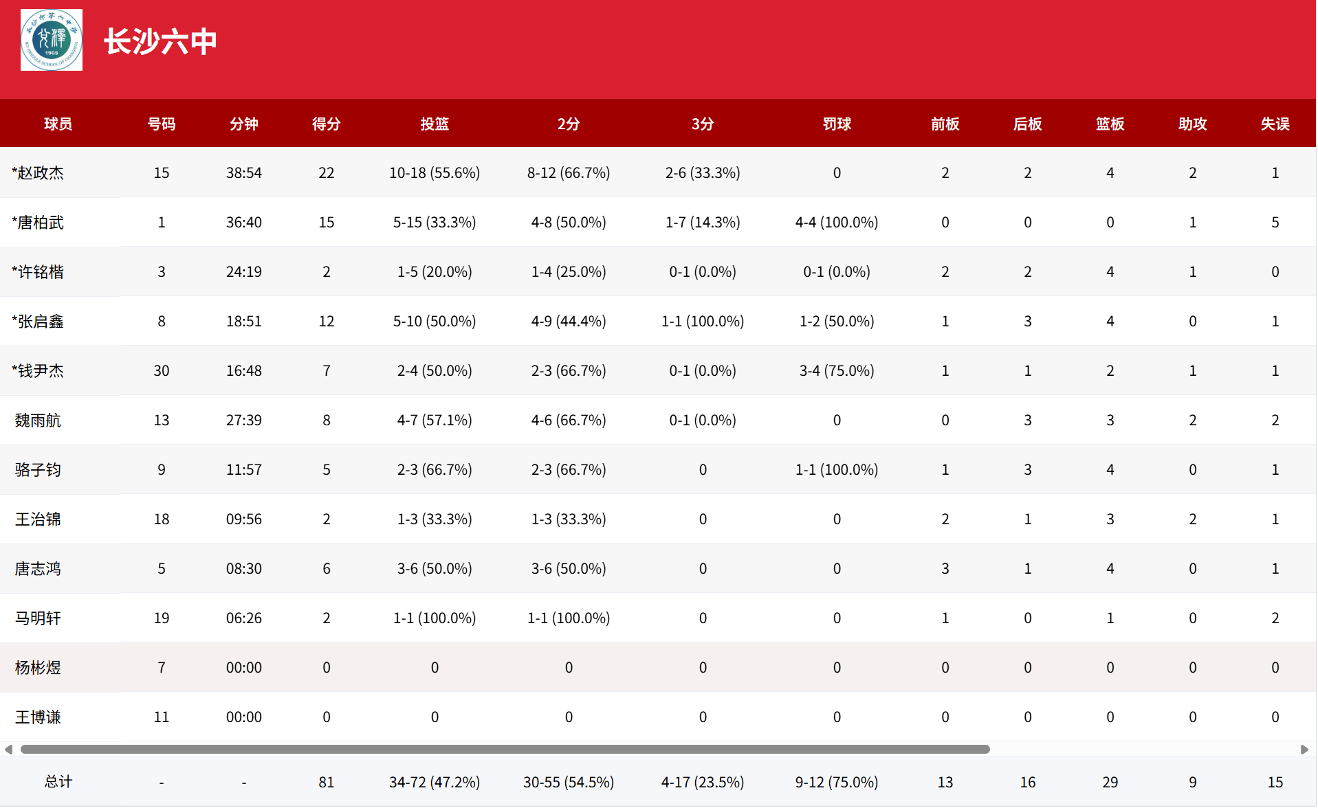 U17全国赛:赵政杰22分,长沙六中81-71沈阳二中