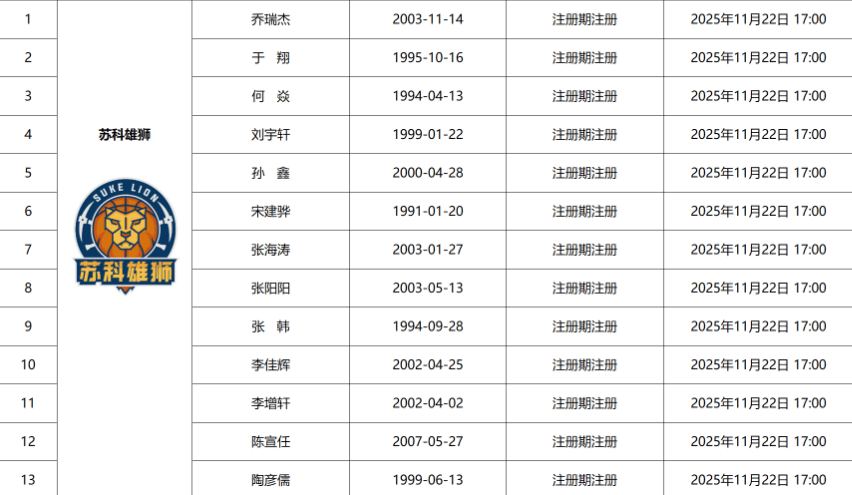 NBL苏科雄狮国内球员注册信息:刘宇轩、张韩在列