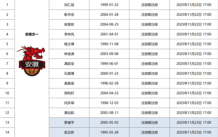 NBL安徽文一国内球员注册信息:刘仁斌、杨文博、袁振梁在列