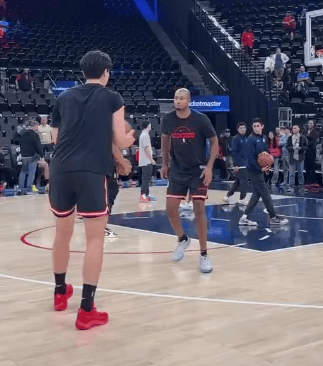 开拓者社媒分享杨瀚森赛前训练片段:热热身,准备开赛啦