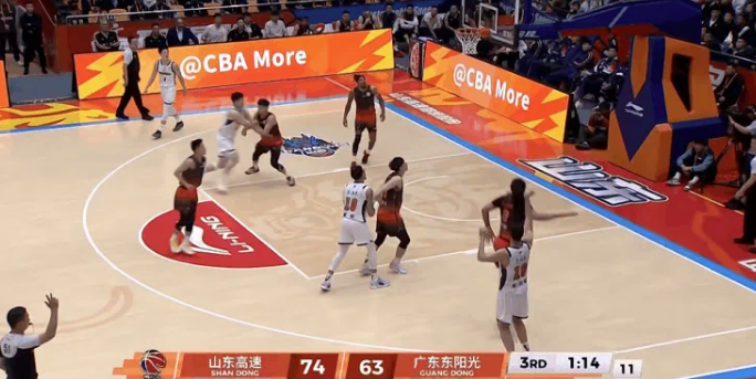 琼斯接高诗岩传球三分命中,山东连得6分打停广东