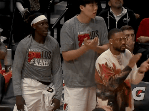 克林根篮下强攻打成2+1,杨瀚森和利拉德替补席起立鼓掌