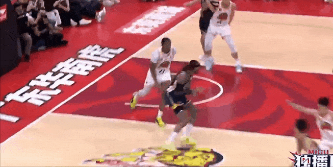 莫兰德落地时身体失衡摔倒在界外,缓和后继续坚持比赛