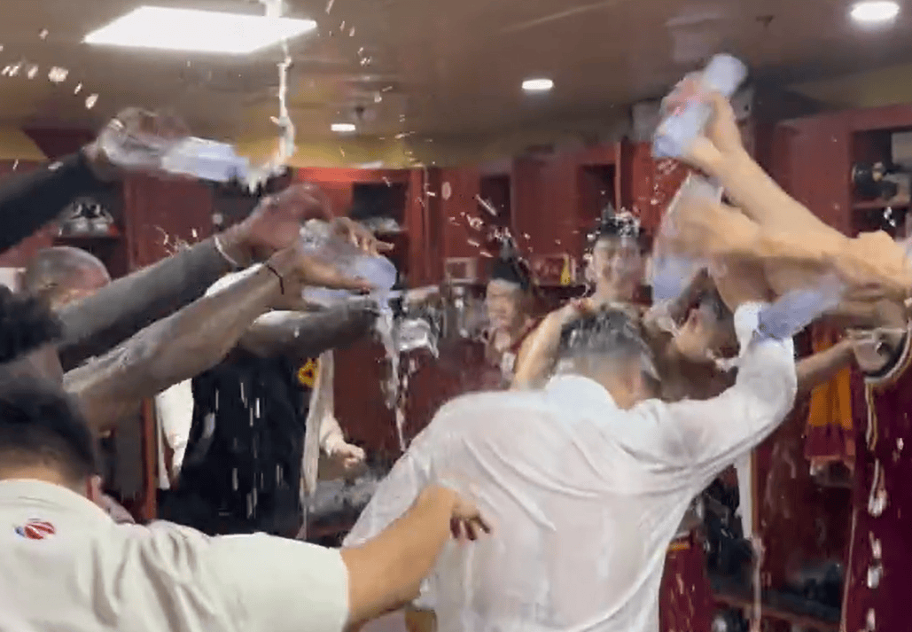 值得庆祝!山西男篮全队赛后更衣室往主教练洒水庆祝