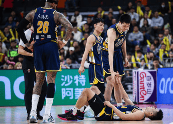 韩德君抢篮板时不慎打到身后的威尔斯面部,威尔斯痛苦倒地