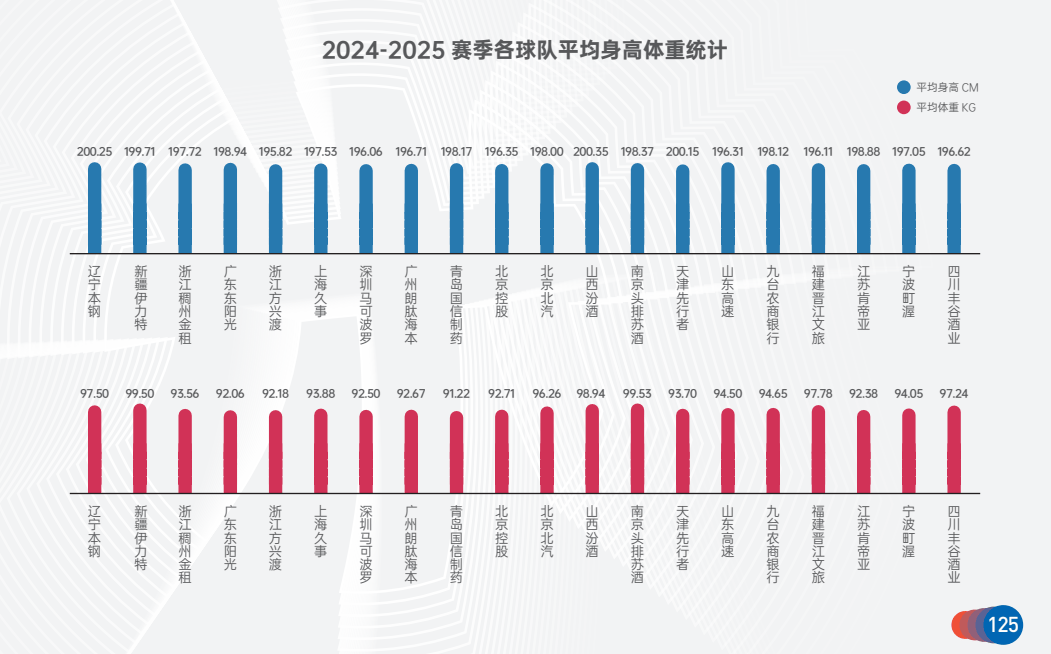 本赛季各球队身高体重榜:山西&辽宁平均身高最高,广厦最低