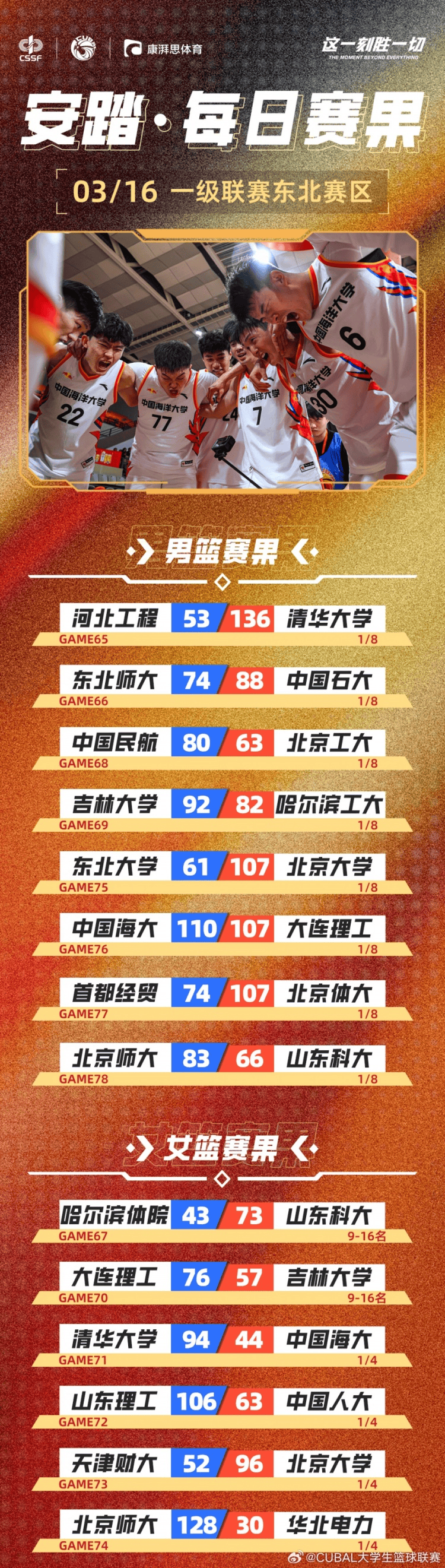 CUBAL:中国海大78-74胜中国石大,获得东北赛区第5名