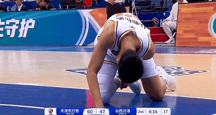 焦海龙防守落地崴脚,随后表情痛苦倒地不起