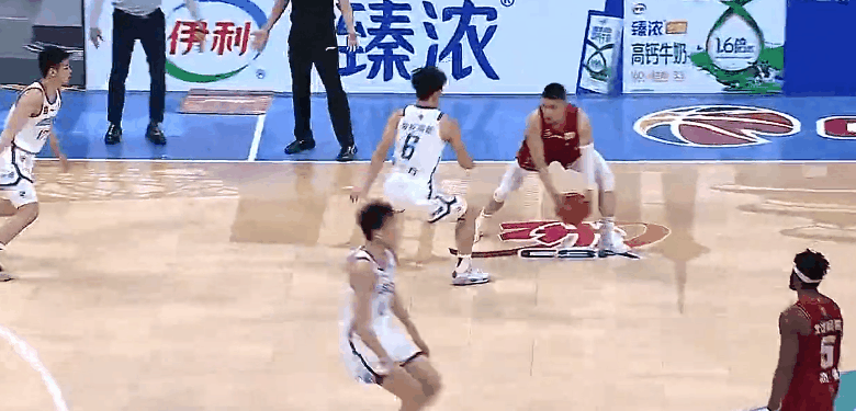 赵睿运球过半场想给劳森空接,结果球砸篮框上