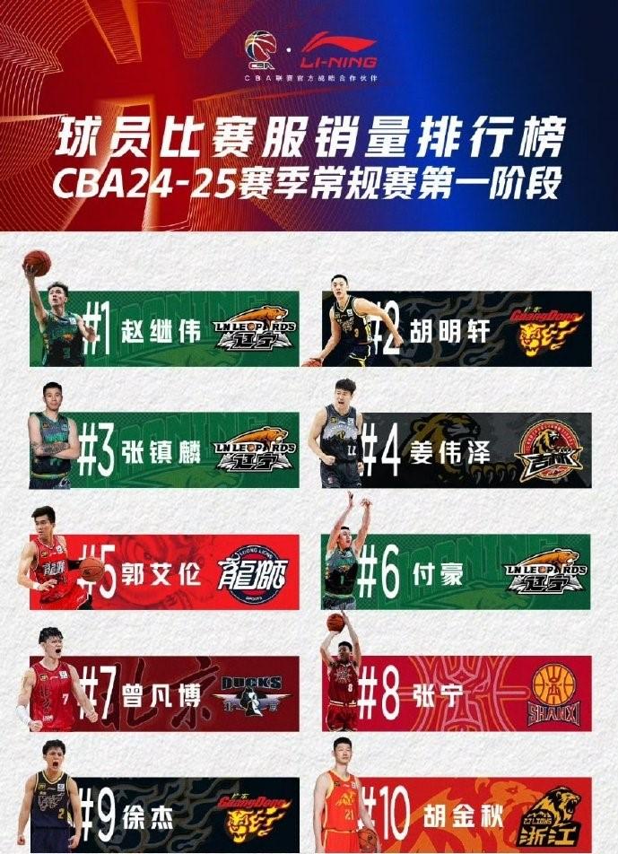 辽粤领衔!CBA球衣销量榜单出炉,赵继伟领跑球员球衣榜