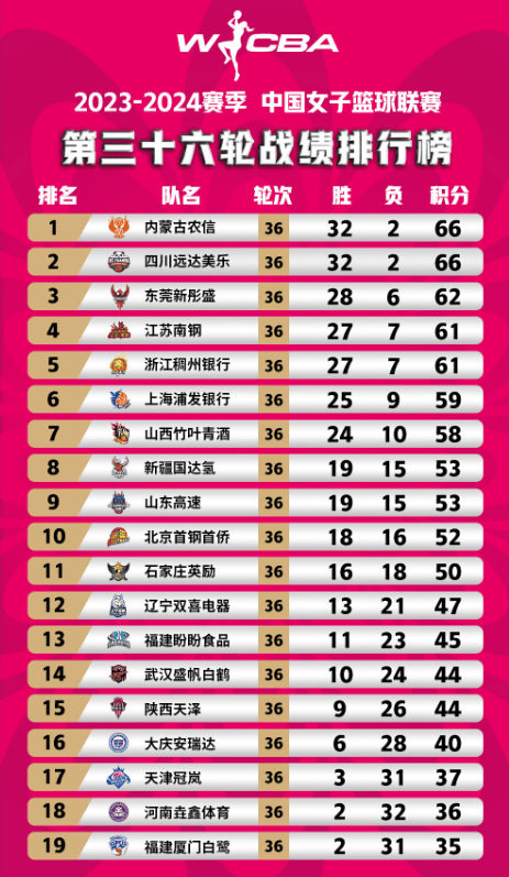WCBA常规赛前三十六轮积分榜:内蒙古和四川同积分领跑