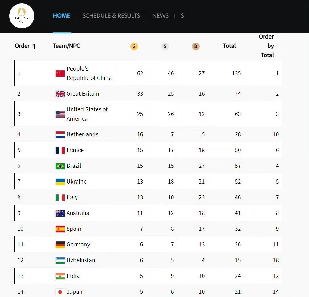 巴黎残奥会:断层领先,中国代表团已斩获62枚金牌!