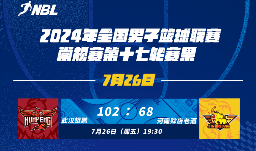 NBL今日赛果:武汉锟鹏102-68大胜河南赊店老酒