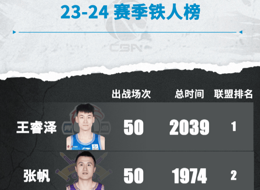 2023-24赛季CBA常规赛铁人榜:王睿泽第一,张帆第二
