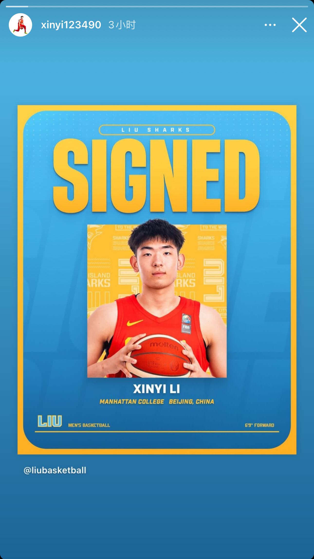 留洋球员李信仪社媒分享加盟长岛大学海报
