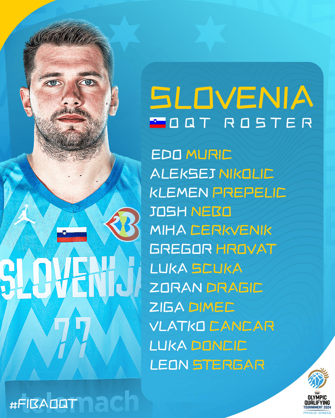 斯洛文尼亚男篮奥运落选赛12人大名单:东契奇、钱查尔领衔