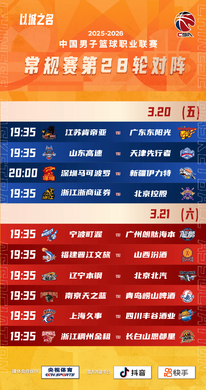 CBA官方分享常规赛第28轮赛程:辽宁vs北京,上海vs四川