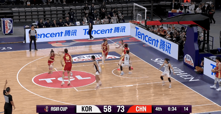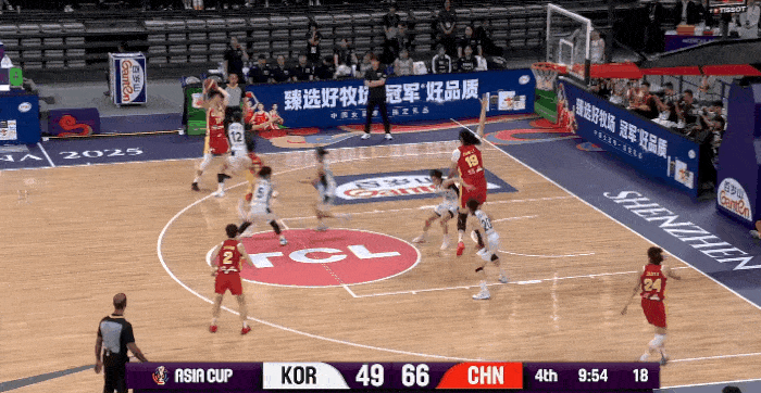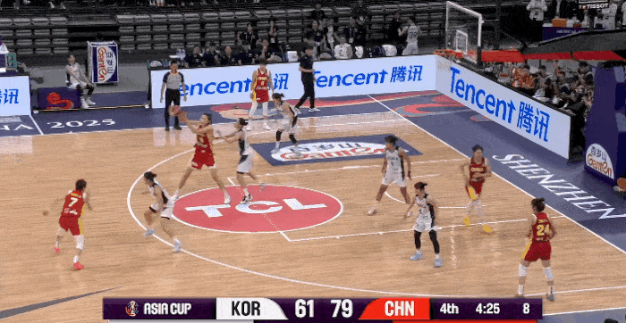 韩旭篮下连续补篮不中,随后跳投命中拿到中国女篮本场首分