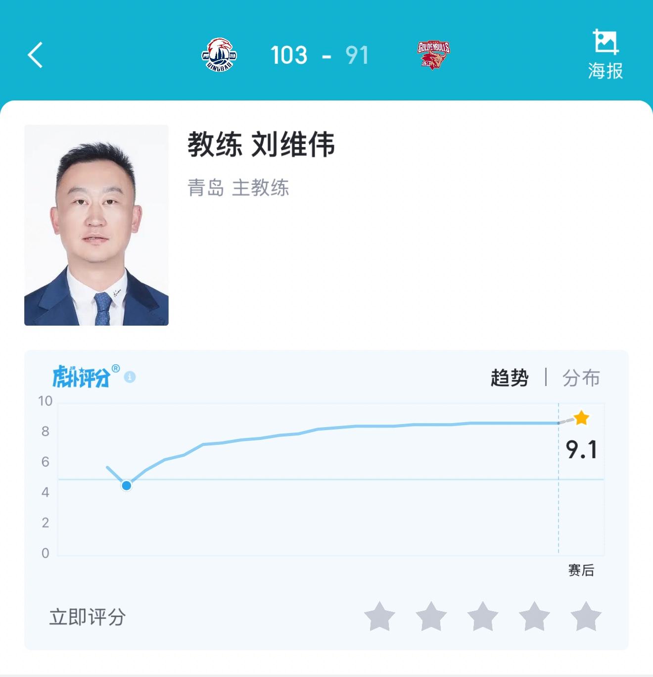 评分一路上涨!刘维伟评分首节4.6分,晋级8强后达到9.1分