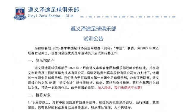 华为赞助的中冠新军遵义泽途发布试训公告,承诺绝不欠薪