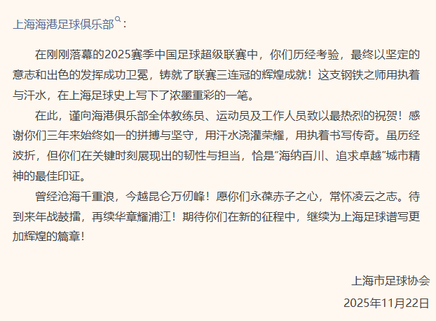 上海足协祝贺海港:在上海足球史上写下了浓墨重彩的一笔