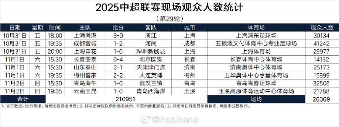 中超第29轮观众人数:海港主场30134人创新高,场均26369人