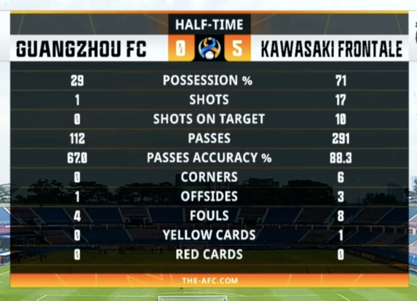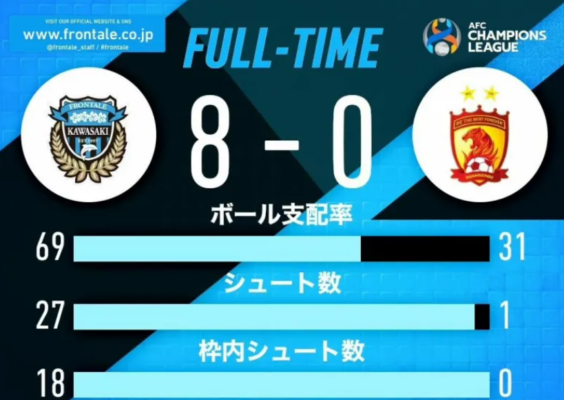 半场数据:广州队惨不忍睹,川崎前锋射门17比1压倒性优势