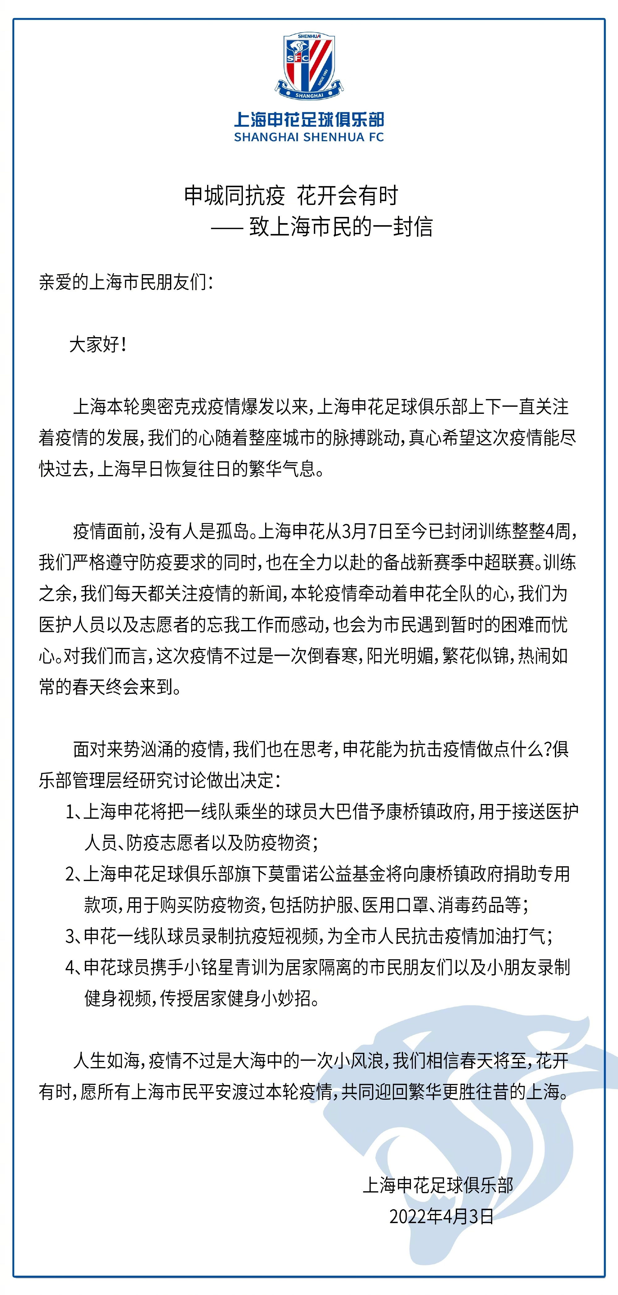 申花发表公开信支援抗疫,将贡献一线队大巴并捐献防疫物资