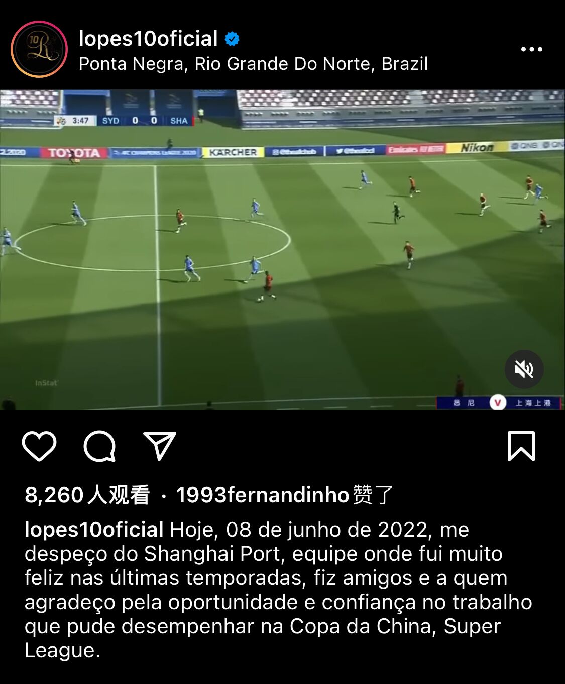 洛佩斯发文告别海港,奥斯卡祝福:兄弟,新的阶段好运