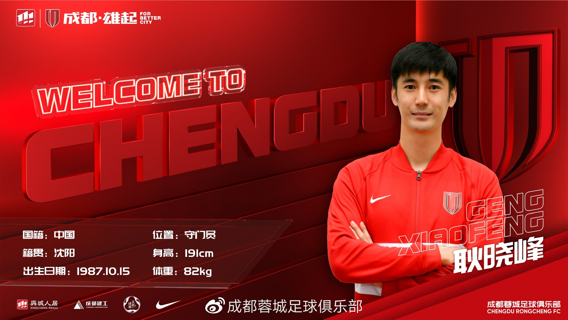 官方:耿晓峰加盟成都蓉城足球俱乐部