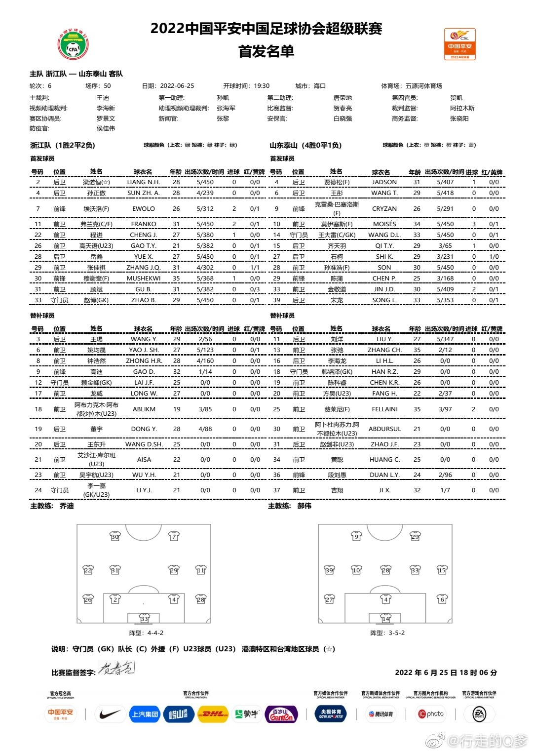 浙江vs山东泰山首发:三外援PK四外援,金敬道、孙准浩出战
