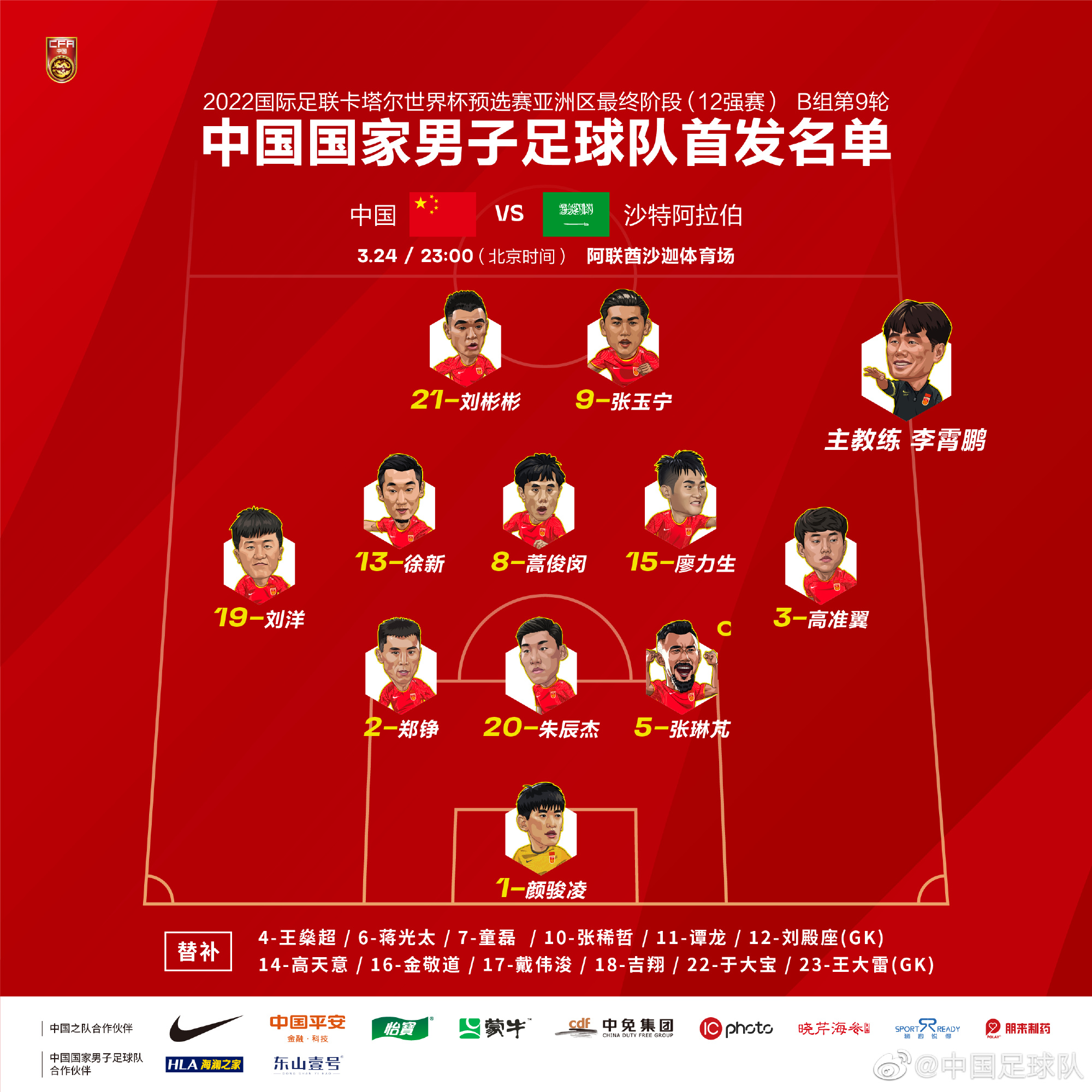 国足战沙特官方阵型:5-3-2,张玉宁、刘彬彬突前
