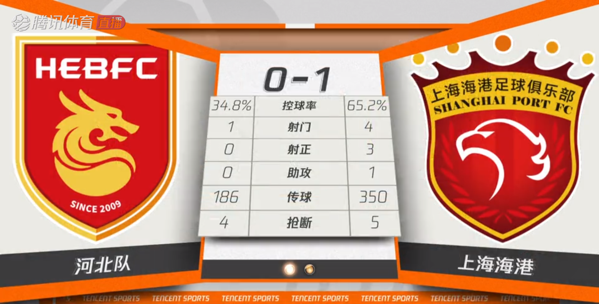 半场数据:上海海港在控球率、射门、射正、传球数全面领先