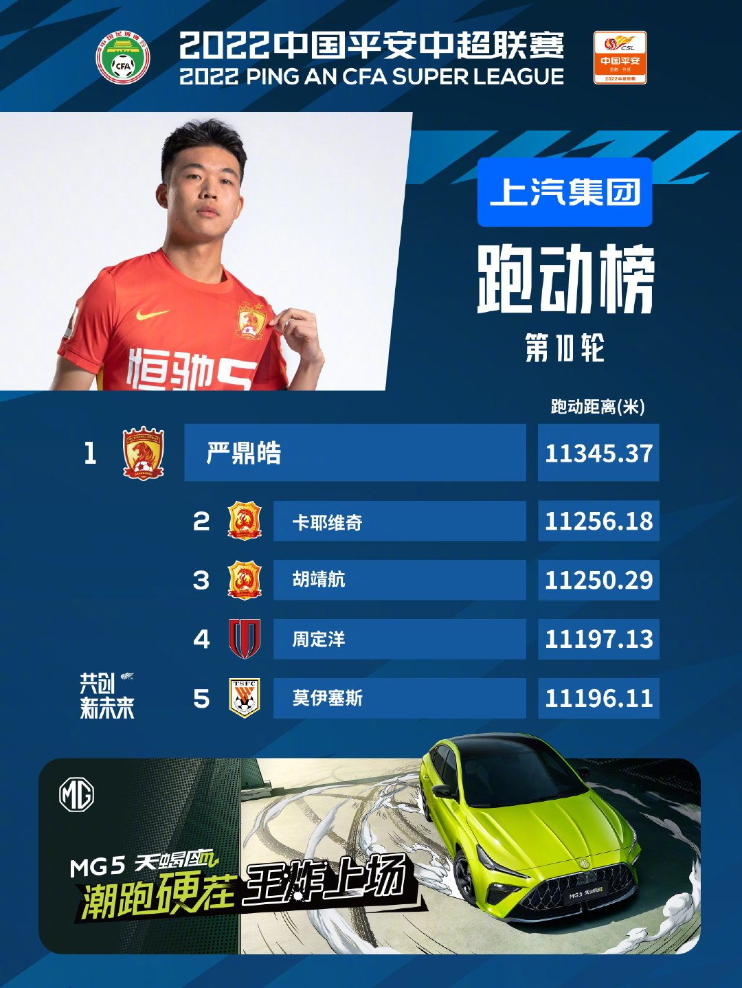 第十轮中超跑动榜:严鼎皓居首,卡耶维奇、胡靖航分列二三