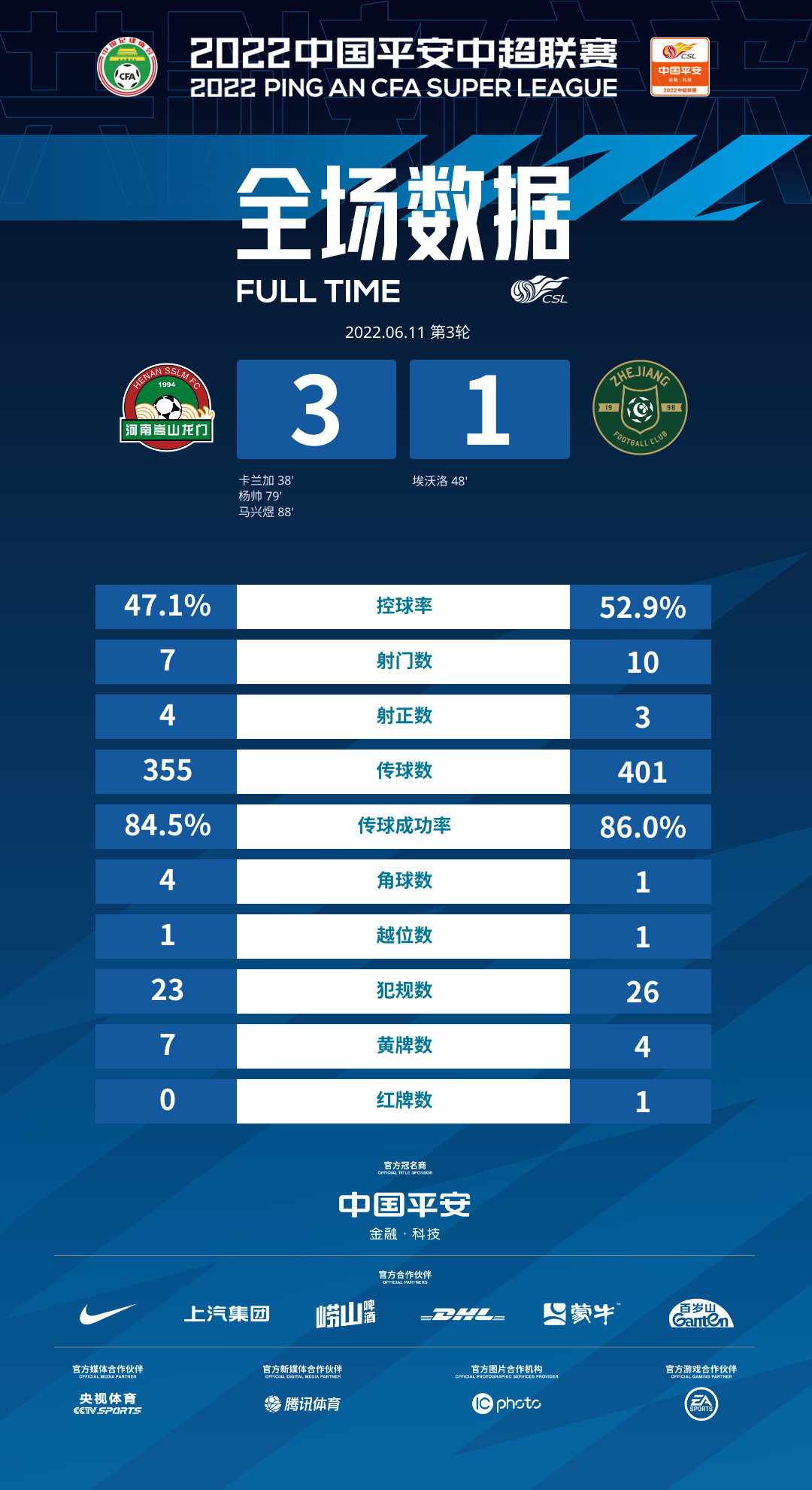 河南vs浙江全场数据:河南4射正3进球,双方11黄1红