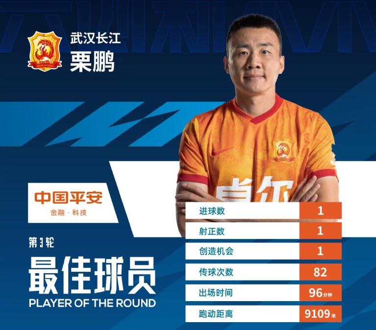 中超官方:头球建功助武汉长江三连胜,栗鹏当选第3轮MVP