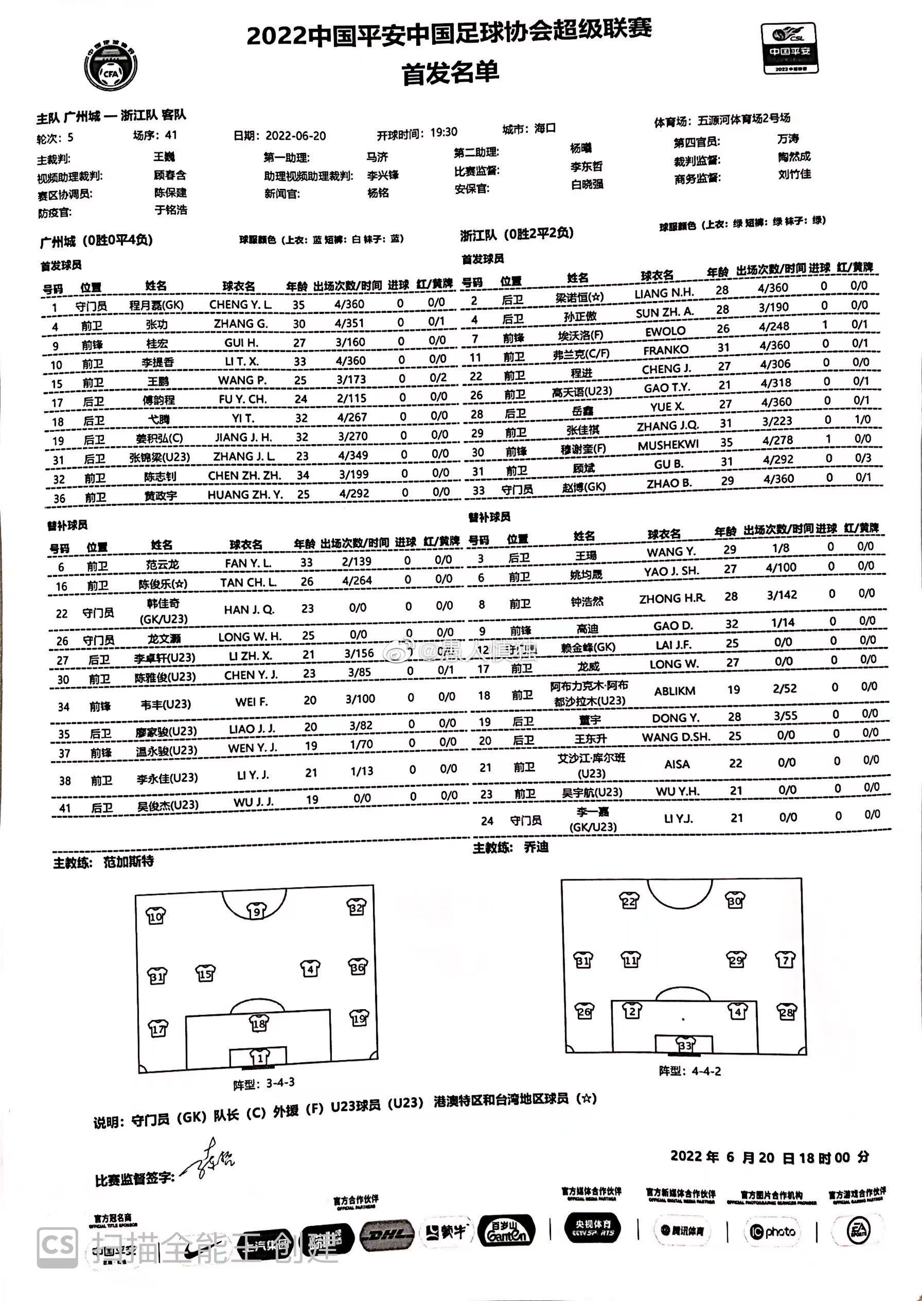 广州城vs浙江队首发:全华班PK三外援,穆谢奎出战