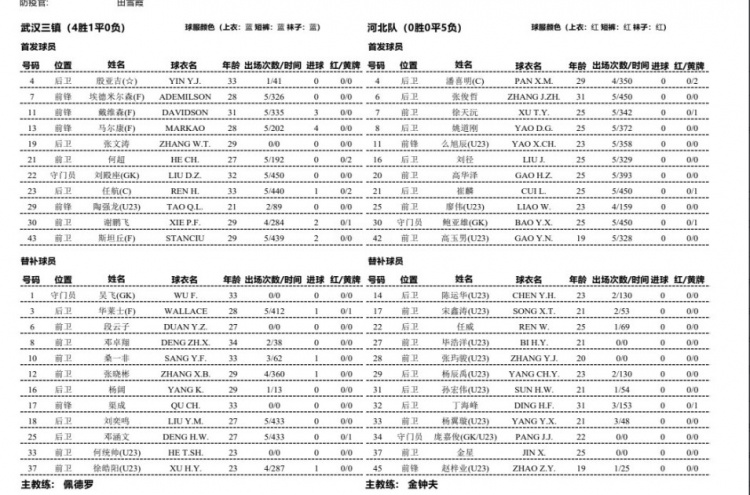 武汉三镇vs河北队首发:斯坦丘、戴维森出战,全华班pk4外援