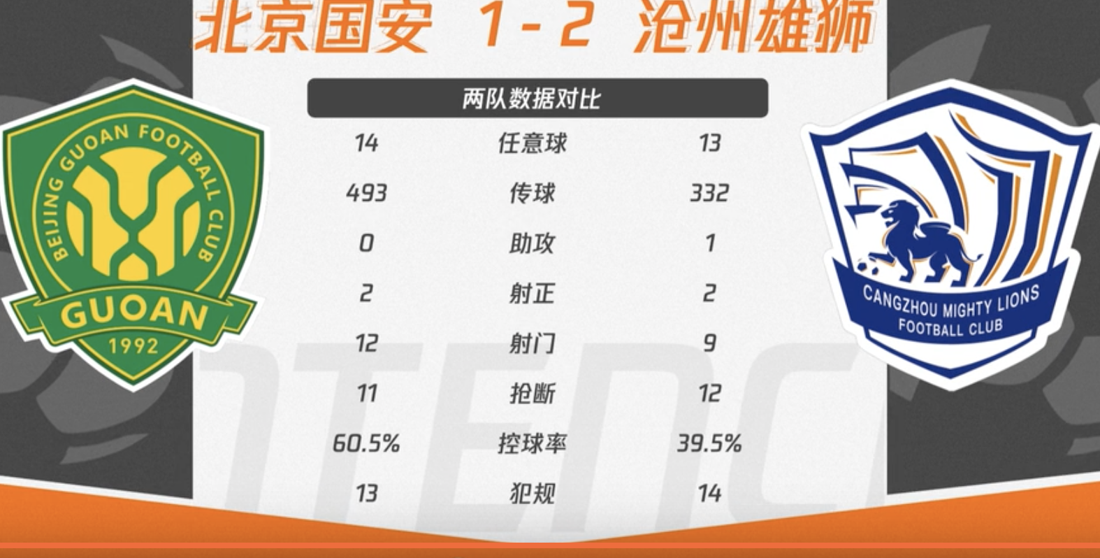 全场数据:国安控球率达到六成,沧州两射正全部打进