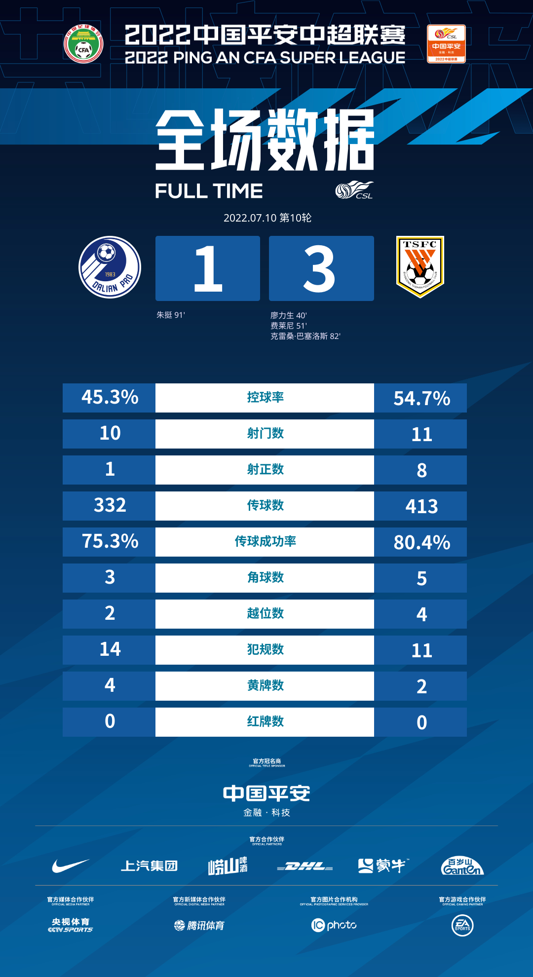 大连人1-3泰山数据:如泰山压顶,泰山队11次射门8次射正