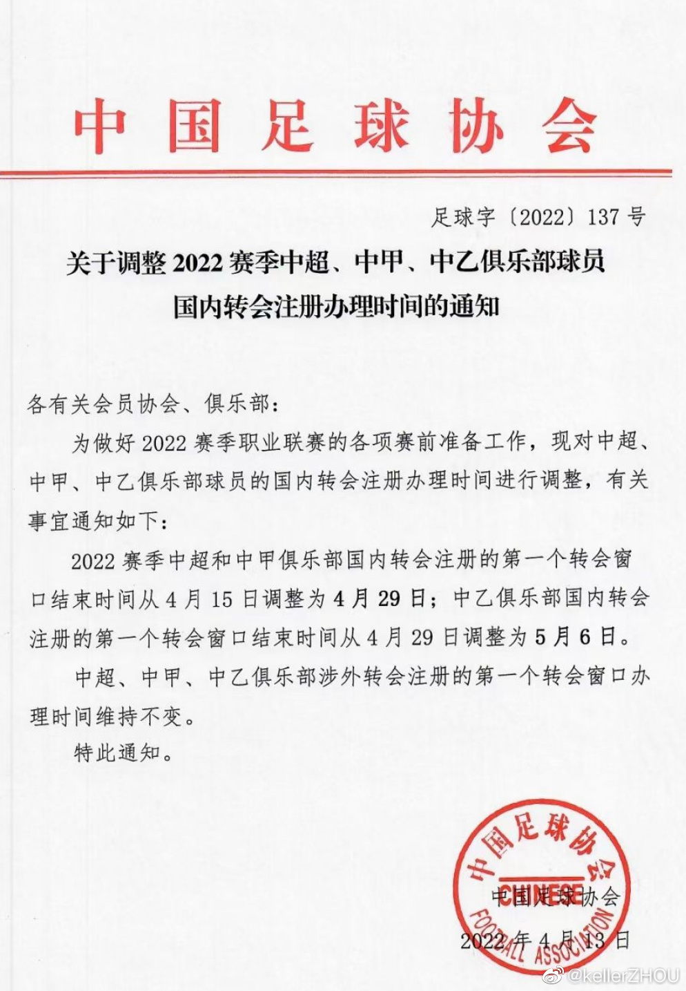 足协:中超中甲国内转会期结束时间从4月15日调整到4月29日