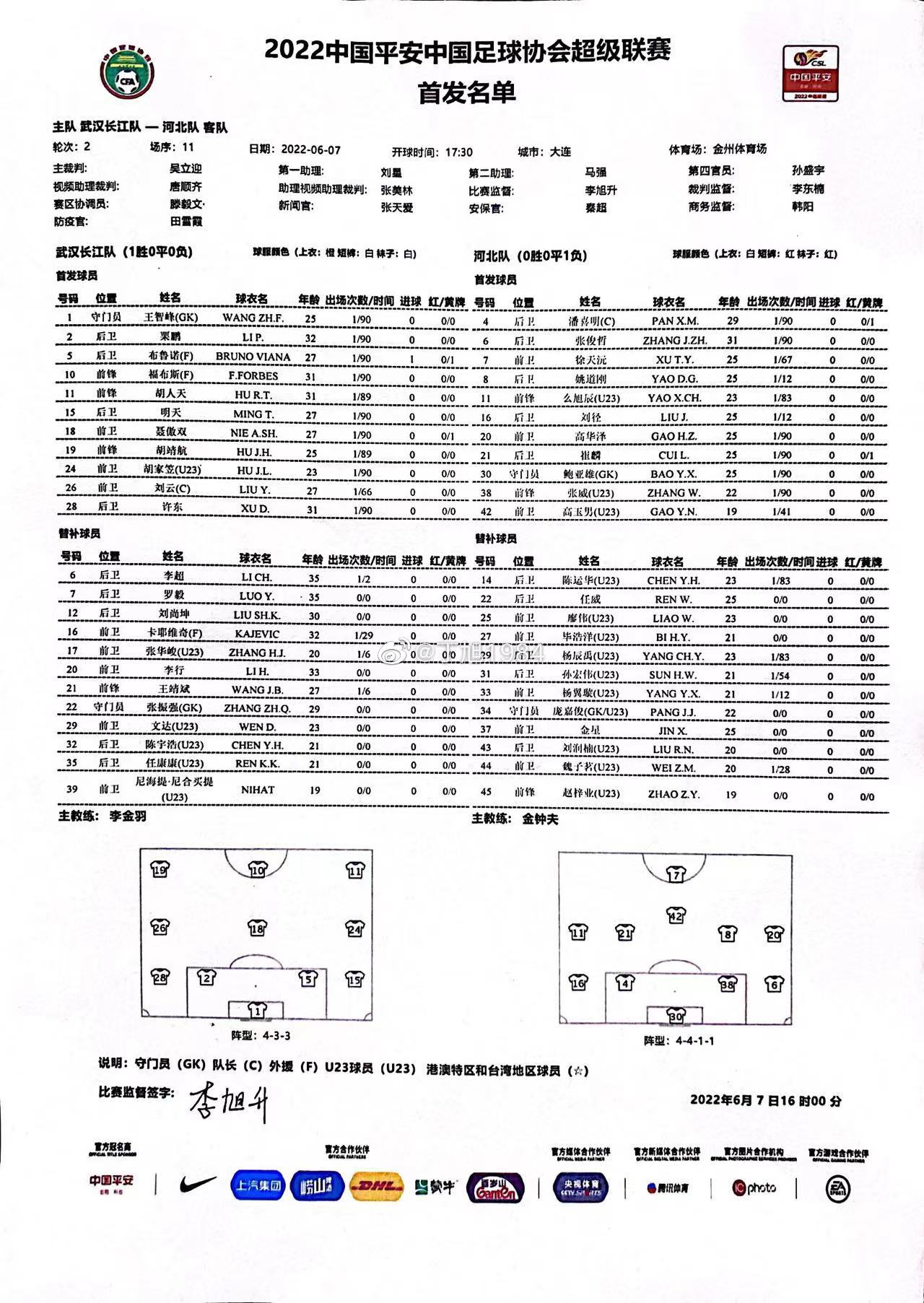 武汉长江vs河北队首发:双外援pk全华班,胡靖航出战