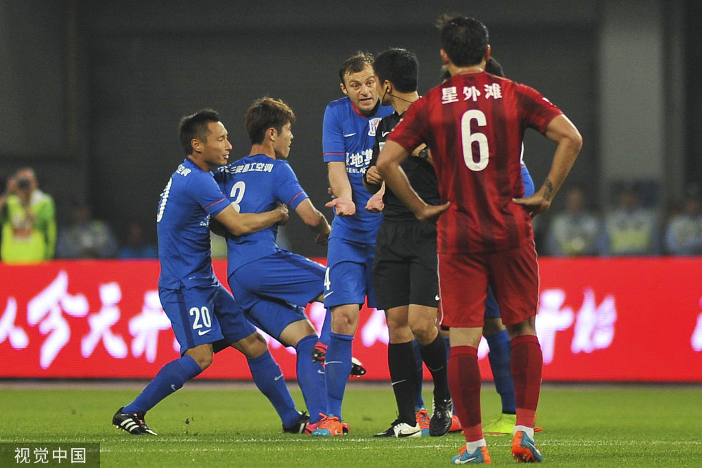 中超上次一个队单场吃3红:15赛季沪上德比中的上海申花