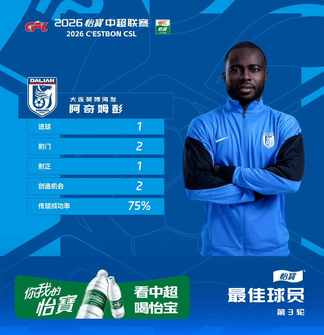 对阵海港打入制胜球!官方:阿奇姆彭当选中超第3轮最佳球员